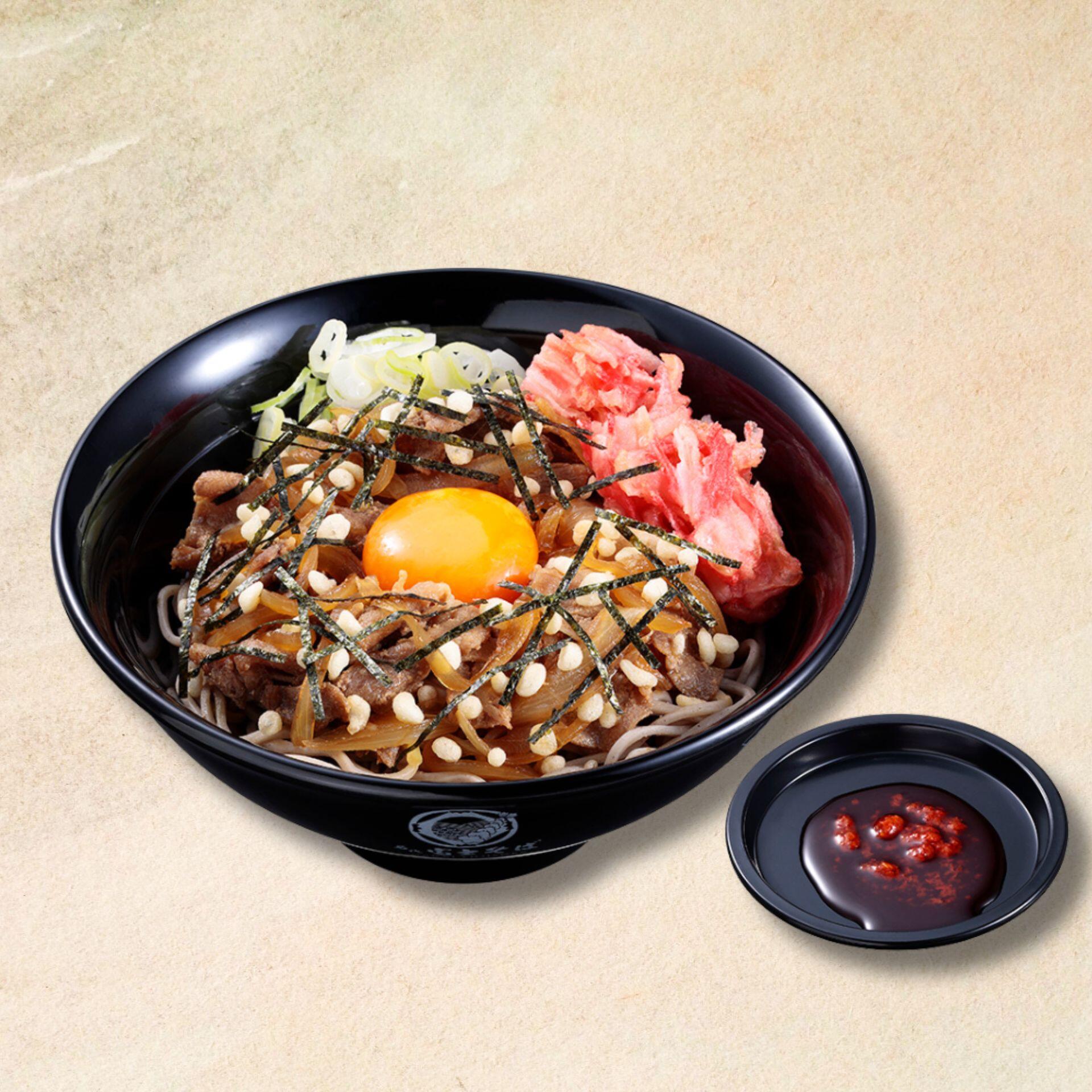 甘じょっぱいつゆで煮込んだお肉をたっぷりと乗せ、富士そばの人気メニュー“紅生姜天”をトッピングした、食べ応えある一杯です。甘じょっぱいお肉と玉子のまろやかさに、紅生姜天の酸味が絶妙なアクセントとなり、最後の一口まで飽きることなく楽しめます。さらに、セットの辛味オイルを加えることで、パンチのある味わいに変化させることも可能です
