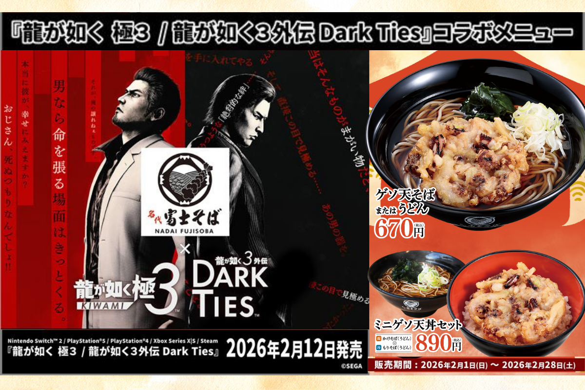 名代富士そば ✖『龍が如く 極3 / 龍が如く3外伝 Dark Ties』コラボメニュー"ゲソ天"2月1日展開開始