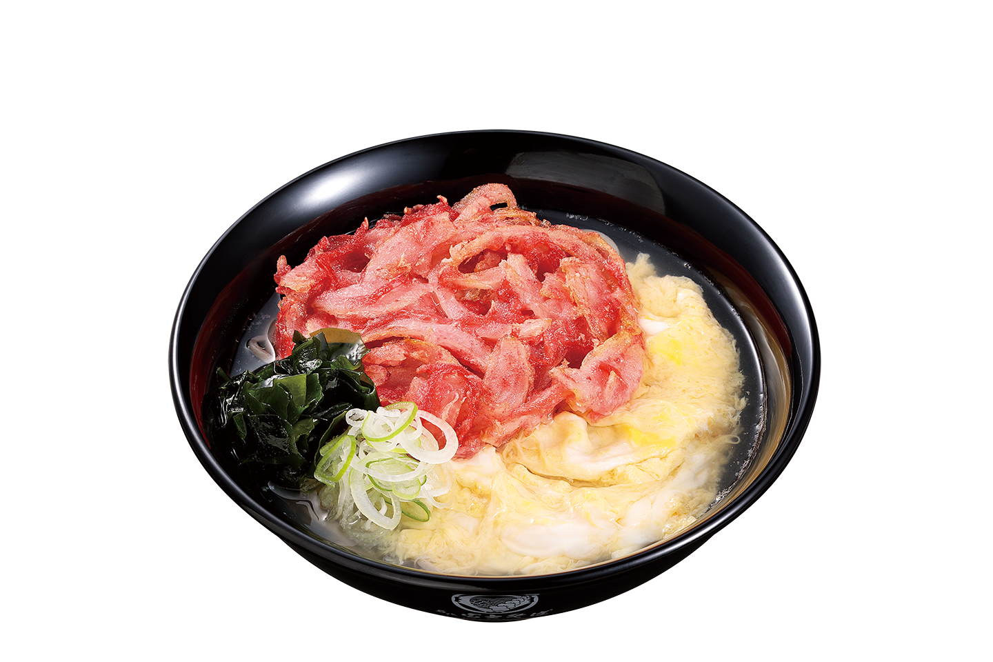 塩だしつゆに明石焼きをヒントとしたふわふわ玉子と名物“紅生姜天”をトッピングしました。ふわふわ玉子が塩だしと融合し、紅生姜天が味わいとしてアクセントになっています。“紅白”の見た目はお正月におぴったりです。