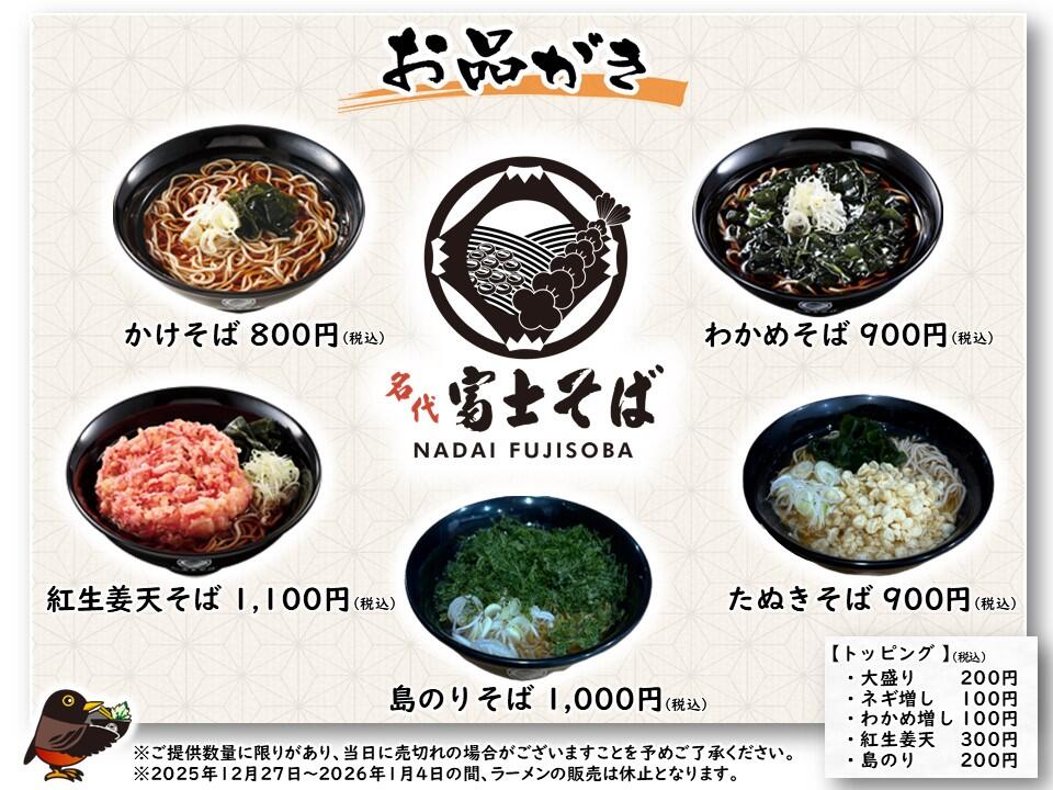 「名代 富士そば」は、2025年12月27日(土)より、三宅島の阿古漁港船客待合所『麺処おあな』に富士そばメニューの提供を開始します。富士そば人気No1のトッピングに加え、三宅島オリジナルトッピングそばも登場します。富士そばが海を越えて三宅島のみなさまの“おそばに”おうかがいします。